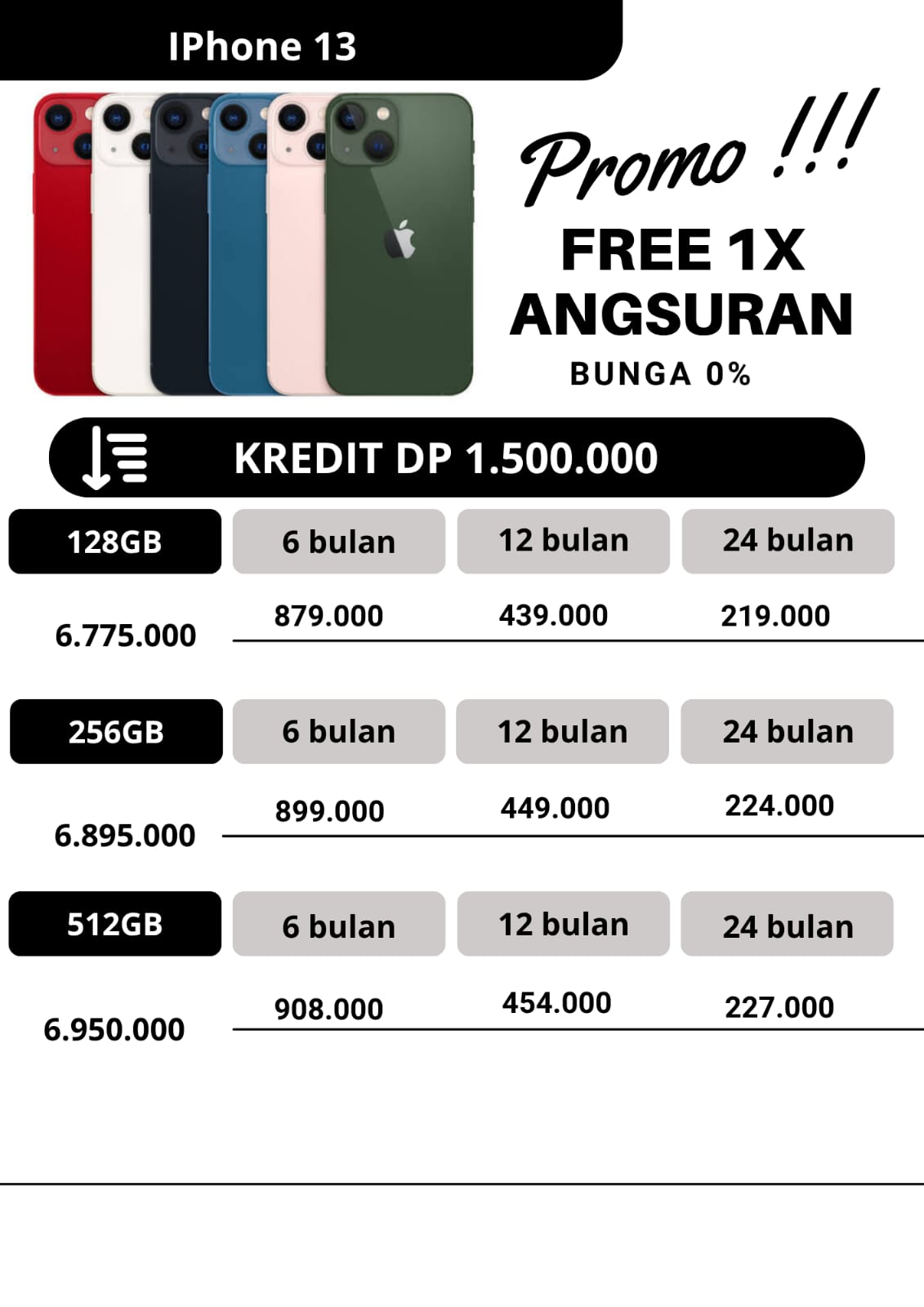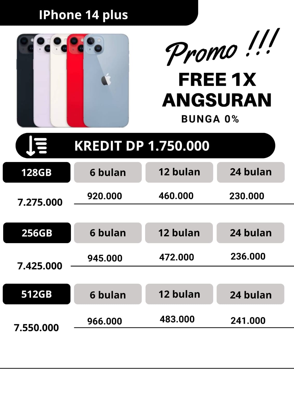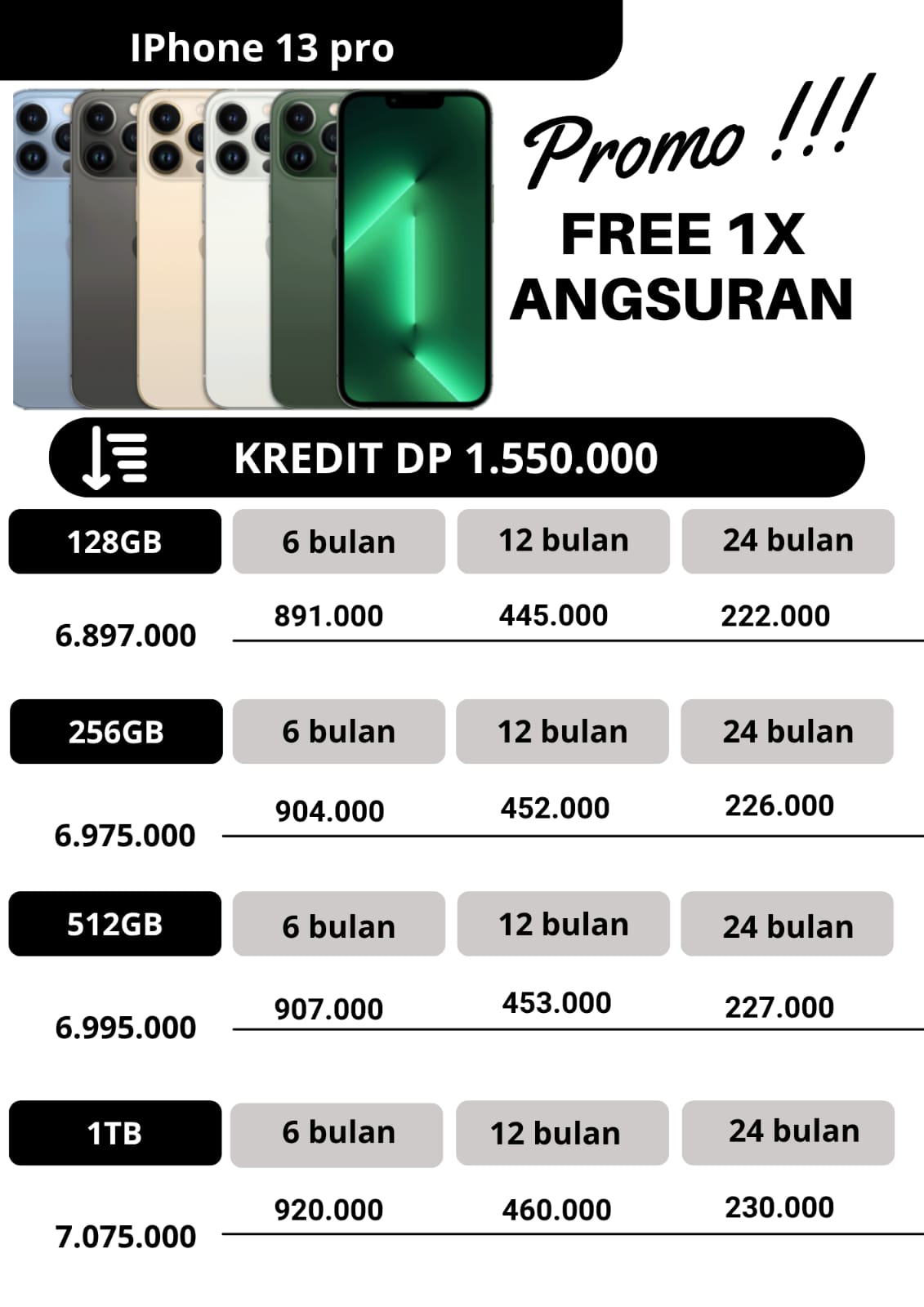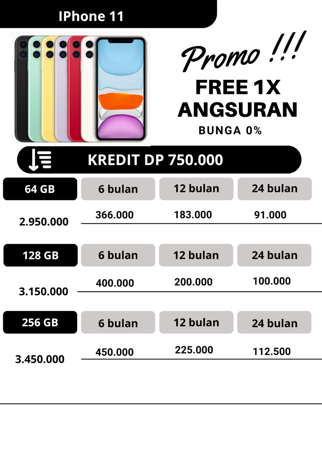 untuk promo kredit, apabila untuk angsuran pertama dan angsuran ke2 pembayaran angsuran tepat waktu dan pada tanggal yang sama,maka pada angsuran ketiga kakak dapat free 1x angsuran.