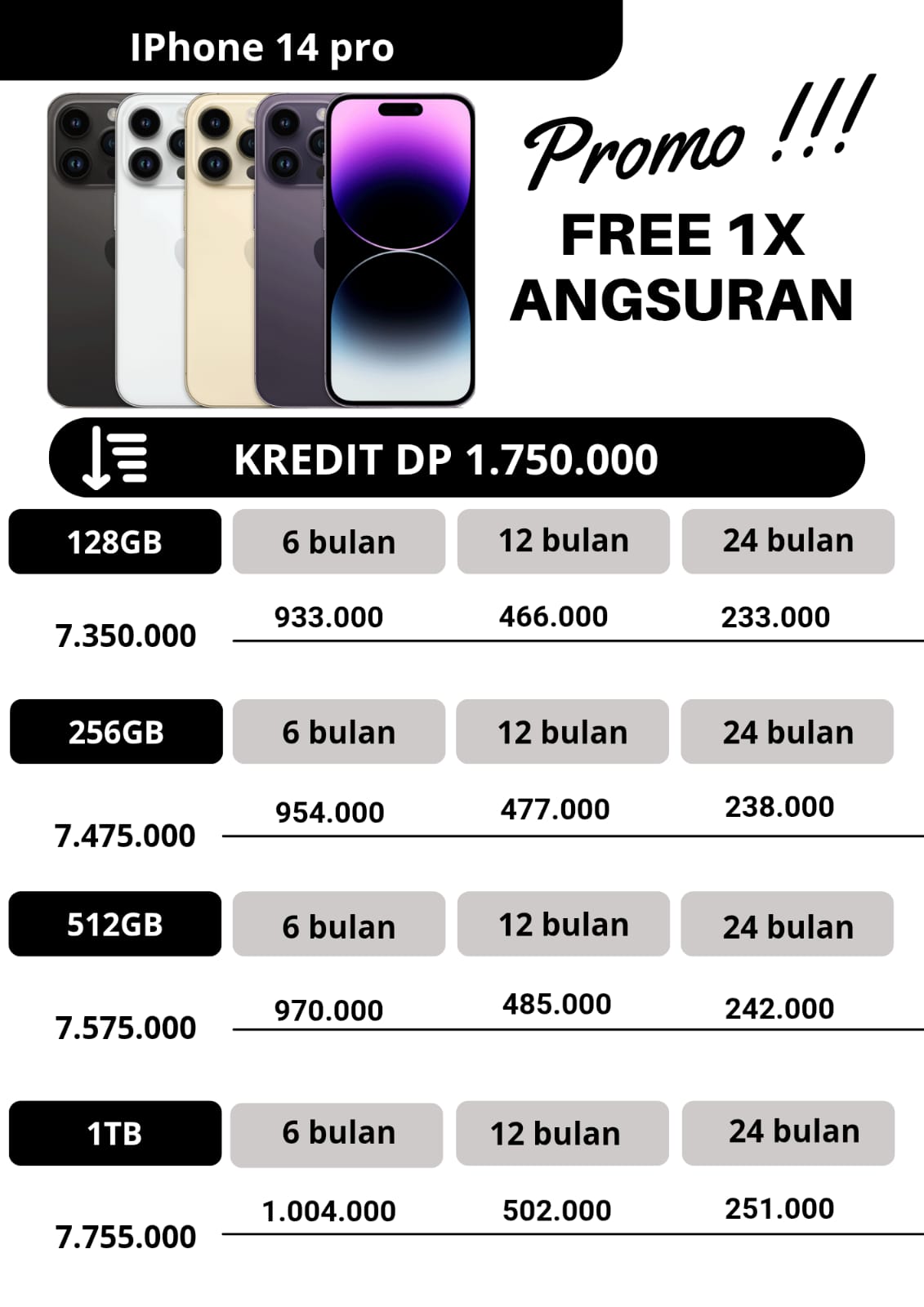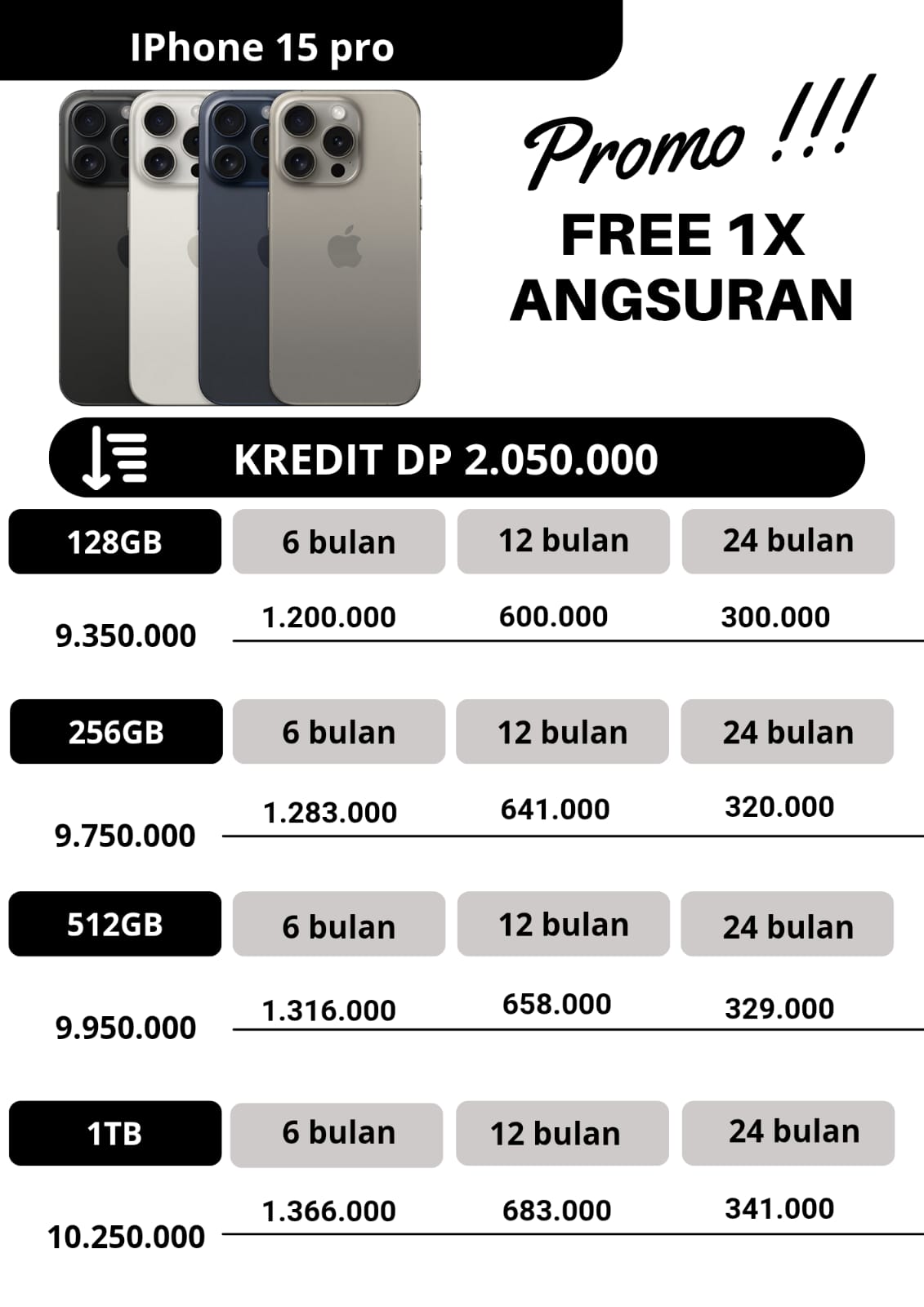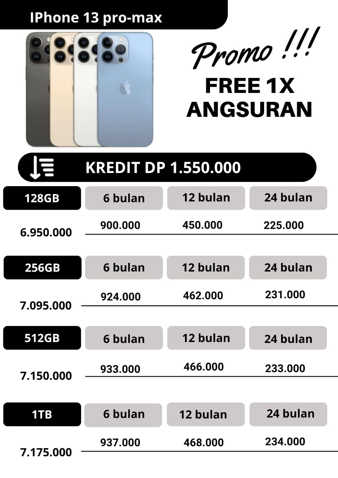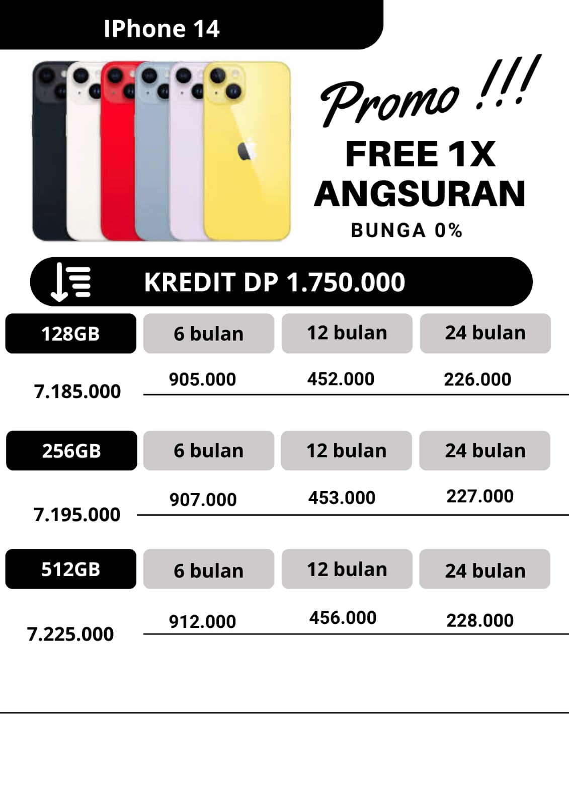 untuk promo kredit, apabila untuk angsuran pertama dan angsuran ke2 pembayaran angsuran tepat waktu dan pada tanggal yang sama,maka pada angsuran ketiga kakak dapat free 1x angsuran.