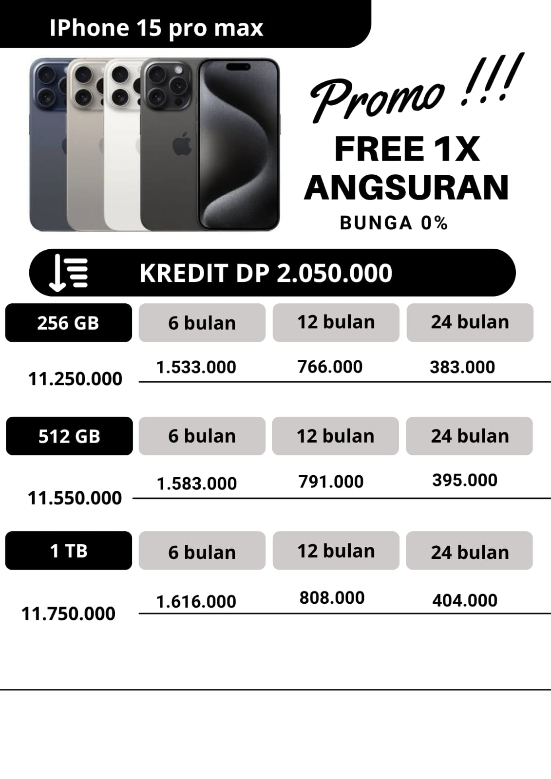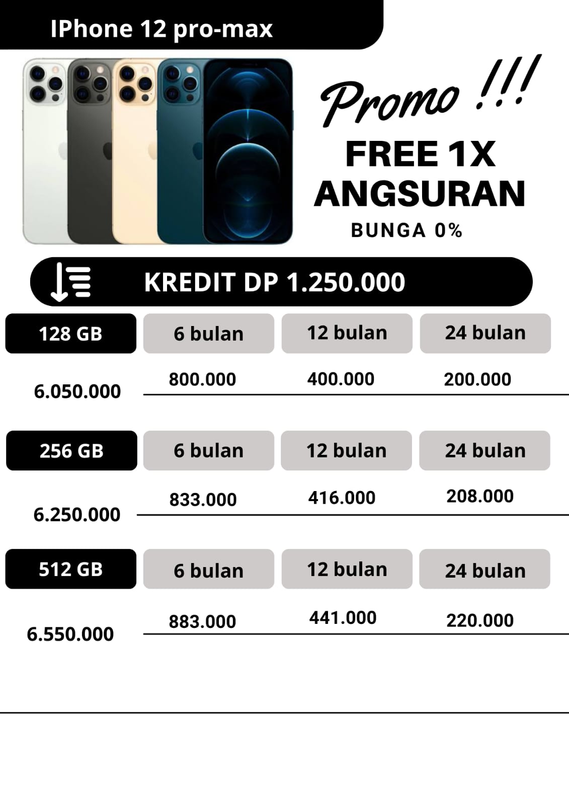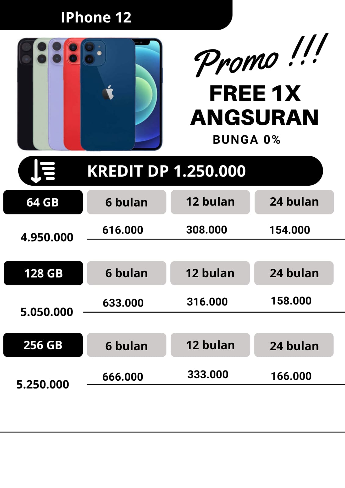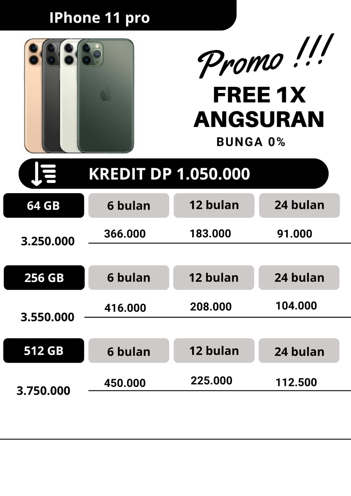 untuk promo kredit, apabila untuk angsuran pertama dan angsuran ke2 pembayaran angsuran tepat waktu dan pada tanggal yang sama,maka pada angsuran ketiga kakak dapat free 1x angsuran.